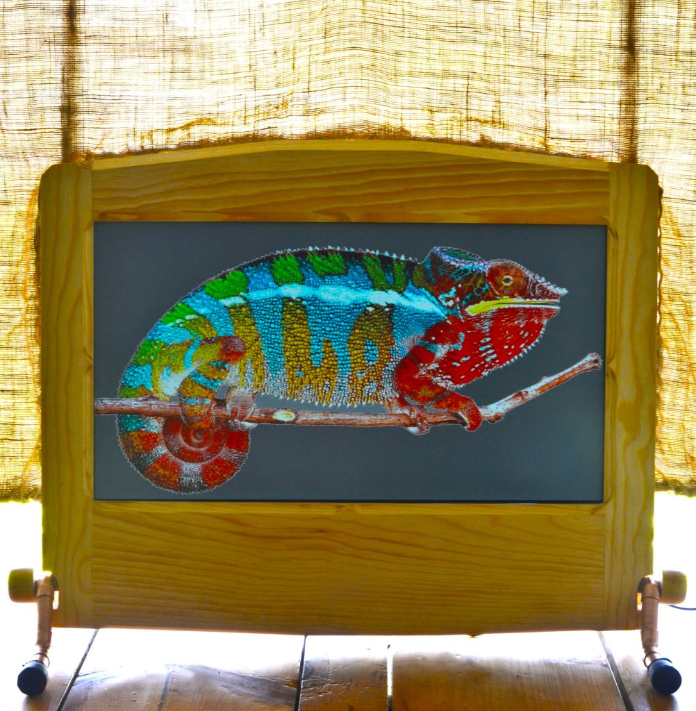 SpectrumView monitors are built to last, made for long working sessions, with quality wood and components, thermally protected by sophisticated airflow cooling design, with genuine brass heat-sink reflectors and high quality low-speed fans, additional EMF shielding available upon request. Copper wiring and strong copper mounts, detachable for transportation or to suspend in front of a window for natural day backlight. The incandescent light bulbs are standard Edison base, size and wattage for household appliances such as ovens, and are approved since they are not used for general space illumination. Everything works with either 120V or 240V at the flick of an inner switch, which means no need to change all bulbs, so you can use 120V bulbs in a 240V country. Twice as many replacement bulbs are included, which should last for many years. Keep in mind that using only incandescent bulbs at full intensity for the whole day yo backlight your SpectrumView will increase your electricity usage, but if solar backlit the overall consumption will cancel out. Also if used during winter the equivalent thermal energy radiated will be subtracted from your heating costs, so cost will cancel out as well. Further research in thermophotovoltaics and nanophotonics, ⁸ will make possible incandescent backlights be more widely available in the future…